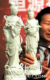 昨天,一对获得1915年美国旧金山世博会参展品金奖的福建德化窑仕女像亮相上海 《中国恒好全球百年世博收藏展》记者会。解放日报图片