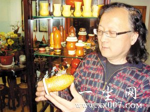 万永强介绍,在清代,“葫芦文化”曾经达到过一个高峰,尤其是宫廷里的将后王爷们,谁都会有几个好葫芦,大家还记得讲述溥仪一生的意大利导演贝尔托鲁齐的电影《末代皇帝》吧,最后一个镜头就是年老的溥仪回到故宫,竟神奇般的从当初的皇帝宝座后面掏出了一只蝈蝈葫芦,可见养蝈蝈、玩葫芦已经是当年的一种贵族文化。“只可惜这位意大利名导对葫芦文化也是略知皮毛,溥仪是皇帝,怎么能玩那种葫芦呢?”万永强指了指自己精心收藏的几件工艺精湛的清代葫芦作品讲,“最起码也得够这种级别的吧,这才是宫里的东西呢。”万永强拿起了其中的一件,给记者详细讲解,这件作品不但葫芦器型讲究,有宫廷里的“官器”味道,最主要的是葫芦口上面的象牙“蒙芯”,雕工简直让人称绝——方寸间雕刻了《西游记》中的师徒四人,正在经过一片树林,树林的中间还吊起了一位用绳子捆住的孩童——正是《西游记》中“红孩儿”中的章节,最叫绝的是,轻轻晃动象牙“蒙芯”,吊起的“红孩儿”还会来回活动,原来,中间连接的锁扣被透雕成了活动的,而且人物的五官表情清晰可见,简直令人啧啧称奇。“这件作品是我好多年前从国外买回来的,给王世襄老爷子看过,老爷子很喜欢,说这东西在清朝当时都是绝无仅有的,能玩它的,最起码是个王爷。”万永强讲,“这也难怪意大利的大导演,这些好东西收藏家都难得一见,你让他上哪找去。”