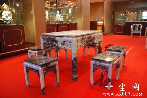 俗话说,室无玉不雅,厅无玉不华,居无玉不安,人无玉不贵。由广州市得盛玉器有限公司提供展出的这批翡翠家具,不仅可以观赏,还可以使用,并且极具收藏价值。此次在京展出6套,除了一组4条屏风是用紫檀和翡翠制作外,其余的桌、椅、凳、茶几等家具全部用翡翠A货制成。据该公司负责人吴财秀介绍,展品中最贵的是一组4把仿清太师椅,分别刻有春夏秋冬图案,价值1200万元;最便宜的是一对仿清圈椅,价值500万元。