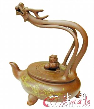 另一套他中意的紫砂壶是一个朋友送的,是两件套。壶把手和壶盖上分别有青蛙、南瓜加青蛙的图案。最奇特的是,泡茶时如果壶盖上的青蛙对着把手上的青蛙,即两只青蛙“亲嘴”,壶底就会漏水,把盖扭开,漏水就停止了。他有时候展示给朋友看,大家都觉得很奇特又好玩。
