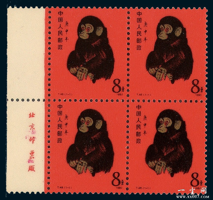 第四种是鼠、虎、兔、龙、蛇、马、羊版票,都是左、右边纸有版铭,位置在第二排、第九排票的左、右边纸上,共有四个版铭。整版票可形成四个带版铭的方联,与前三种类型不同之处是这些方联可带两边边纸,即带顶边或底边的方联(左上、左下、右上、右下),而前三种类型的方联只能带左或右一边的边纸。另外从打孔的情况看,猴、鸡、狗、猪四种版票齿孔直打通边纸;牛版票竖行打通边纸,横向只打到边纸的一半;鼠版票和其余的生肖版票齿孔横竖都只打到边纸的一半。