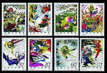提起西游记题材邮票,就不能不提到1979年发行的T43《西游记》特种邮票,这套邮票的设计汲取了京剧和动画片的一些特点,运用中国民间年画的处理方法,工笔单勾,重彩浓染,人物略有夸张,使孙悟空的形象鲜明地活跃在方寸之间。8枚邮票分别展现了“水帘洞”“战哪吒”“蟠桃园”“八卦炉”“打白骨”“芭蕉扇”“盘丝洞”和“取经路”。这套邮票发行之后还有一个“小差错”,其中“战哪吒”“蟠桃园”以及“八卦炉”邮票中,孙悟空都身着虎皮裙。但从原著上来看,这些故事都发生在跟随唐僧取经之前,而穿虎皮裙是跟随唐僧以后的事,时间相差五百年以上,发现这个错误的是上海的一个小学生。