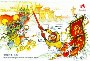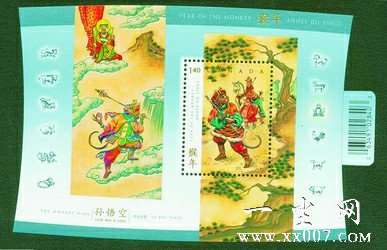 从国外邮政发行的邮票来看,“西游记”的影响也是非常大的。2004年,加拿大发行的猴年生肖邮票,设计图构思都取自中国古典小说《西游记》中的西天取经,图案分别为孙悟空大战玉皇大帝以及悟空向师傅悔过,上有中文“猴年”和英文Yearof the Monkey字样。无独有偶,2004年澳大利亚发行的猴年邮票也取材于《西游记》。