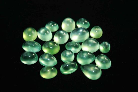 3、好的葡萄石切工完美。挑选时我们看葡萄石是否圆润,如果葡萄石酷似水滴状,椭圆形也很标准,那么它自然就是好的葡萄石。