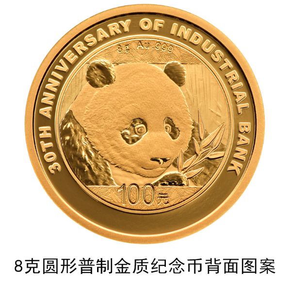 8克圆形金质纪念币背面图案为熊猫食竹图,并刊“8g Au .999”字样、“30TH ANNIVERSARY OF INDUSTRIAL BANK”英文字样及面额。