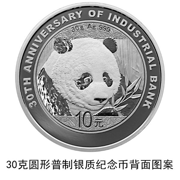 30克圆形银质纪念币背面图案为熊猫食竹图,并刊“30g Ag .999”字样、“30TH ANNIVERSARY OF INDUSTRIAL BANK”英文字样及面额。