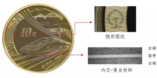 硬币外环为黄色铜合金,内芯为具有独特机读性能的镍带复合白铜材料。