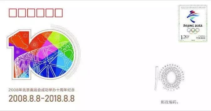 北京奥运会10周年主题纪念封,全套一枚,贴“北京2022年冬奥会会徽”邮票,纪念戳图案为2008年奥运火炬和国家体育场组成的数字“10”。既表达了北京奥运会成功举办10周年的主题,又彰显了北京双奥之城的特点。