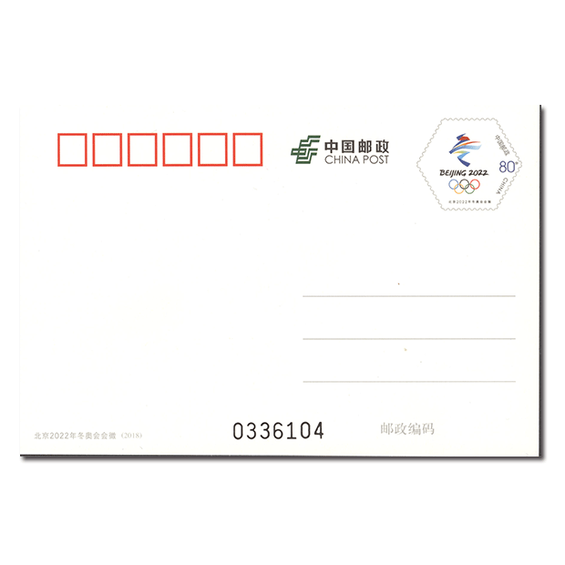 中国邮政定于2018年8月8日发行《北京2022年冬奥会会徽》普通邮资明信片1套1枚。详情如下: