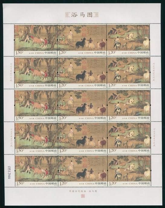 浴马图小型张邮票的票面设计十分的新颖独特,因为,马既是12生肖当中的一种,又有着非常好的蕴意,在中国,马就代表着中华民族自相不息的精神,而这幅浴马图又是中国的历史名画,把中国的历史名画作为邮票的图案设计,构思非常的独特,因为名画一直都是收藏者最喜爱收藏的作品之一,把名画和邮票相结合在一起,这简直是完美的结合。这次的浴马图小型张邮票全套共包含3枚,另外还有小型张1枚,其中3枚邮票的规格大小各不相同,整套邮票的面值加起来一共3.9元,而小型张的邮票面值是6元,每张邮票都先用了现代高科技的防伪技术,纸张采用先进的防伪纸张制作,纸张上边还使用了高科技的防伪油墨设计,纸张的边缘处还采用了异形齿孔的设计,还有荧光喷码的防伪技术。