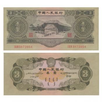 第二套人民币3元面额纸币,前后共使用了9年,是为纪念井冈山革命根据地周总理指定印刷发行的,由苏联代印。是借鉴当时苏联的卢布常用“三”的面额。此版币是中国唯一的一枚三元面额纸币。目前存世量甚少,一般市场里常能看见的,是经过粘贴修补的旧币,没多少实际收藏价值。由于全国人民对周总理有着独特的情怀,基本有此张纸币的收藏者都不愿意出手,以纪念周总理。第二套人民币3元券市场非常稀有。