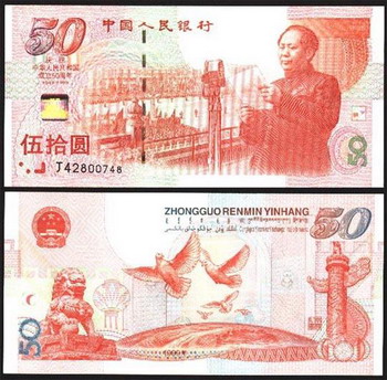 这款纪念钞颜色相对来说比较特色,是一款红色色调的钞票,正面图案是开国大典的盛况图,左侧是天安门广场的庆祝人群,同时右侧配以毛泽东在天安门城楼讲话的情景,左上角和左侧中部则分别有庆祝中国人民共和国成立50周年的字样及其它一些基本信息,背面图选用的是比较有特点的几种图案的组合图,包括了地球、和平鸽、狮子及华表等,一般情况下就算是假冒的纪念钞应该不会在这方面犯错,目前的技术对图案及整体色调的模仿应该相对比较容易。