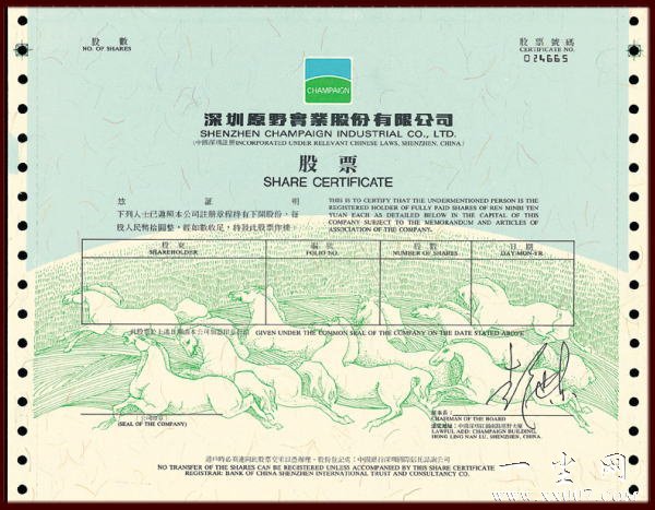1994年1月30日,代码仍为0005的世纪星源,重现在交易所的荧光屏上,它就是经过改组的原野公司股票,第一大股东为香港中国投资有好限公司,占38.23%的股权;第二大股东是深圳城建开发集团占12.5%股权。被停牌折腾的股民奔走相告,喜上眉梢,电话传递、公共汽车、茶楼等公共场合,无不响着原野股票的话题。事后原野公司董事长彭建东从澳门被诱捕,并法判服刑。期间澳大利亚政府进行多次外交交涉未果。后来我国总理访问澳大利亚,澳总理再次提出释放彭建东,未多久澳籍华人彭建东被驱逐出境。看着原野股票那些随风而逝的往事,以往股市的神奇都从中散发出来,看蓝天万里无云,原野无边无际,仍留下历史的痕迹。看神驹对天长嘶,似壮志未酬。看群马奔腾、溅起多少世事如烟。所以收藏股票实物意义非凡,具有极高的研究和收藏价值、艺术价值。
