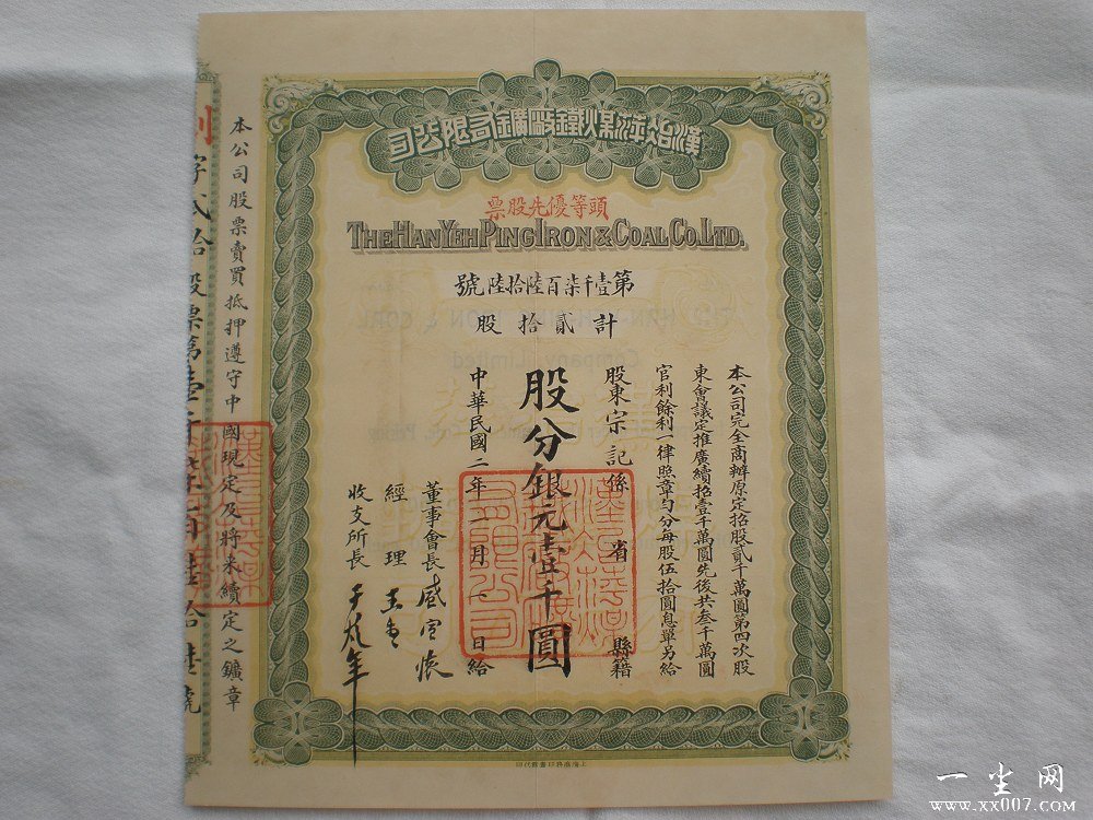 汉冶萍煤铁厂矿有限公司始建于1890年,由清朝两广总督张之洞创建,l896年11月起由清末大臣盛宣怀接办。1908年合并公司下属的汉阳铁厂、大冶铁矿和萍乡煤矿,成立汉冶萍煤铁厂矿有限公司.盛宣怀誉为中国近代企业的开拓者.创办轮船招商局、湖北煤铁开采总局、上海电报总局、华盛纺织总厂、中国通商银行、张裕葡萄酒厂等企业