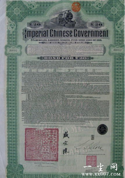 湖广铁路20英镑债券是清政府于1911年宣统3在欧洲发行的债券,首次发行600万英镑,由清政府邮船部大臣盛宣怀签署,每券售价不明,到期后可以5%利息分80次偿还,近百年的文物老债券,深具史料价值。