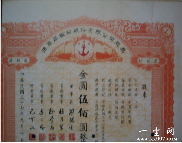 如图 “招商局轮船股份有限公司股票”发行于1948910,票面额为5股,总金额为金圆500元。董事栏里的一串名字,在“上海滩”上都是赫赫有名的:除了董事长刘鸿生(火柴大王)、常务董事杜月笙大家比较熟悉外,总经理徐学禹是宋子文的心腹,曾任上海电话局局长、浙江省公路局局长、福建省银行董事长等职;常务董事李景潞曾任北洋政府交通部鲁政司司长、国民政府经济部次长等职;常务董事包可永曾任上海电保局局长兼国际电信局局长,他还是被称为“鸳鸯蝴蝶派”开山鼻祖和“通俗文学之王”包天笑得大公子。