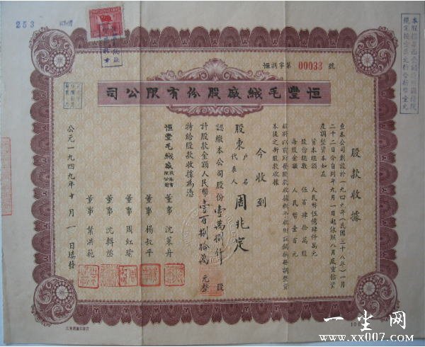 为纪念建国60周年,山东卫视于2009926星期六2230《说事拉理》栏目中第一次介绍并展示了于公元1949101填发的上海《恒丰毛绒厂股份有限公司》股款收据。“恒丰毛绒”的横空出世不仅是证券收藏界的重大发现,也是中国历史上具有特殊意义的文物史料。从该股款收据背面的原始记录看,自1950年始至1956年,每年的分红股、分红利定息的发讫记录均为俱全,由此可以证实从未转换过股票。在股据的正面右上角盖有“本股据票面金额遵照国务院规定按壹万元折合新币壹元”字样,其中认缴股份、计股金额、诸位董事的签名和印章、公司的钢印、盖销的印花税票(上有新中国1949年版国旗和地球图案)等股票的基本要素完整。上述信息的记载足以证明《恒丰毛绒厂股份有限公司》股款收据就是当之无愧的新中国成立后发行的第一枚股票。