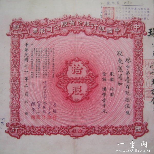 “中国银行股份有限公司股票”面值有壹股、伍股、拾股、伍拾股、壹佰股五种。如图为拾股、发行于民国11年,底版上含有无数个“中国银行”的字样的网纹图案,呈水波无限扩散状,既寓意中国银行的业务范围不断展,又起到了很好的防伪效果。
