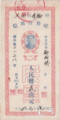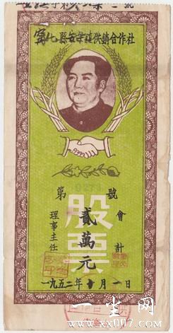 股票收藏已经在金融界引起了广泛的注意,这是缘于上个世纪所发生的一件重大事件--当年邓公就赠送给到访的美国证券业界人物一套上海的老八股,因此,不管这只是一种宣传推介还是一种国礼,中国的证券实物已然引起了世人的极大关注!把这项藏事做大做强,则要归功于沪上的一部分藏家,他们敏锐地感觉到了赠股事件中隐约透着的收藏研究的积极因素,以及此间散发出的无限商机,大举介入了中国老股票的收藏,并取得了很大的成绩--一批连国家级收藏机构都忽视了的中国金融证券文物,经过他们持续地、顽强地挖掘,渐次浮现在了世人的眼前:清代的,民国时期的,苏(维埃)区及解放区的红色股票,还有解放后各个时期的老证券,不断地被发掘出来了... 沪上的这种时尚收藏,很快就传扬开来了,苏州、南京等地的藏家迅速地跟进,纷纷成立了老股票收藏研究队伍,据本人与以上各地的专藏人士交流,他们的收藏规模都很大,收藏研究也很精深,不仅有创办研究会刊,还建起了专藏网站,并且还开展了国内外的交流探讨......这些交流与探讨是十分有益的,客观上也促进了我国股藏事业的进步,最明显的一点就是,分类逐渐开始细化,专题逾加深入,研究更能贴近历史和社会热点,股票作为历史文物的属性得到了极大的阐扬,这可以在各大拍卖行逐渐接受并上拍中国老股票一事上得到了明证。如今,实物老股票已经不再是钱币研究的附属藏项了,已然是一门独自发展的专业收藏事业,并且由于品种的增多,越来越多的人开始进一步精工细作,把住细分的藏项之瓶颈--清代老股票,红色(指苏区及解放区)老股票,合作社股票,公私合营老股票,上市公司股票,股票认购证......股藏界的热络,引起了高层的极大关注,毕竟这也是一档历史文献,各级公藏机构却几乎没有典藏,于是,他们透过中国的两大证交所--上海证券交易所和深圳证券交易--所纷纷与藏家们沟通,图录出版了中国有史以来最大的老股票专辑,各界大佬纷纷书题作序作赋予以庆贺(有兴趣者可以自己去找来看看),股藏于是蔚然大观矣!本人偏居于东南海陬,没能跟上沪上的步伐,仅凭着自己曾经参与原始股的怀念,加上有那么一点点的文献学基础和收藏的愚钝常识,介入到了股票收藏中来,但限于自身精力、财力与眼力,只敢专注于本地的那些老股票,十多年了,也算攒下了一些老旧的纸头(当初也并不是要做什么学问,也没想到它们居然是可以做学问的),上自清道光年间,下讫于今,举凡涉及股份之旧纸,概为之收罗,也堪称是省内蔚然大观矣--一段区域内的证券史书,在俺嘀裤腰带上拴着呢,又遑顾及其余破烂纸头耶?!金证藏事,恰如其名,一个时代有一个时代的价值观和审美观,仅仅从价值发现的角度来看,实物老证券未经市场的充分洗礼,目前还仅仅是发现、发掘阶段,其间的各种价值属性也未完全释放出来,这,不正是收藏的真正魅力吗?!!!(秋荷) 福建·毛泽东像合作社股票 之三种基本款式: