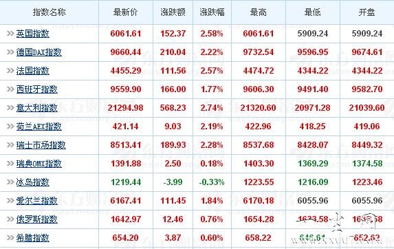 周三,欧洲股市集体走高:泛欧绩优股FTSEurofirst 300指数周三收高2.56%,本季跌幅超9%。欧元区绩优股Euro STOXX 50指数高收2.34%。英股富时100指数收高2.58%,报6061.61点;法股CAC指数收高2.57%,收报4455.29点;德国DAX指数大涨2.22%,收报9660.44点。