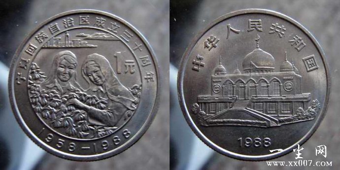 为了纪念和庆祝我国宁夏回族自治区成立三十周年,中国人民银行特在1988年发行了这样一枚纪念币。纪念币的正面图案为银川南关清真寺,清真寺的全景图非常宏伟壮观,在纪念币上方刊有“中华人民共和国”的年号,纪念币下方有“1988”年号。纪念币的背面图案为两个笑颜如花的回族姑娘,一边谈笑一边采枸杞的图画,在纪念币的内缘上方有贺兰山的远景图。并且在纪念币的上方印有“宁夏回族自治区成立三十周年”字样,纪念币刊“1958-1988”字样,并且刊有壹元面额。