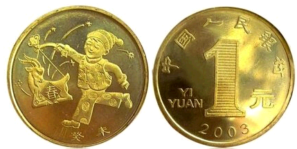 中国发行生肖纪念币已经有很多个年头了。提起生肖纪念币大家一定不会陌生。那么生肖贺岁纪念币我想大家应该也有所耳闻吧。这是我们中国在2003年开始才推出的新类型纪念币。同为生肖纪念币,但它存在的意义是为了贺岁。2003年是我们中国的羊年,中国人民银行发行了首枚贺岁纪念币—羊年贺岁纪念币。该纪念币的背面是一个小男孩,身穿羊马褂,手拿羊灯笼,高高兴兴的大跨步跑。这枚纪念币的正面呢是中国人民银行以及2003年号和面值1元等字样。它是由沈阳铸币厂铸造的,材料是黄铜合金,直径是25毫米,发行数量是1000万枚。这枚纪念币和人民币的职能相同,和人民币等值流通。