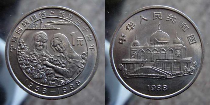 1988年是宁夏回族自治区成立30周年的日子,为了庆祝这个伟大的日子,中国人民银行在1988年9月20日发行了宁夏回族自治区成立30周年纪念币,面值是1元,重量为2.16克,以铜镍合金为原材料制作而成的,发行数量为156万枚,直径为30毫米,品相为十品。是由沈阳造币厂制造而成的。该纪念币的正面图案是宁夏的清真寺的景色,并刻有“中华人民共和国”的国名和“1988”的年号,背面的图案是两名回族少女采摘枸杞的劳动场面,还有贺兰山作为远景图,并刻有“宁夏回族自治区成立三十周年”的“1元”的字样。