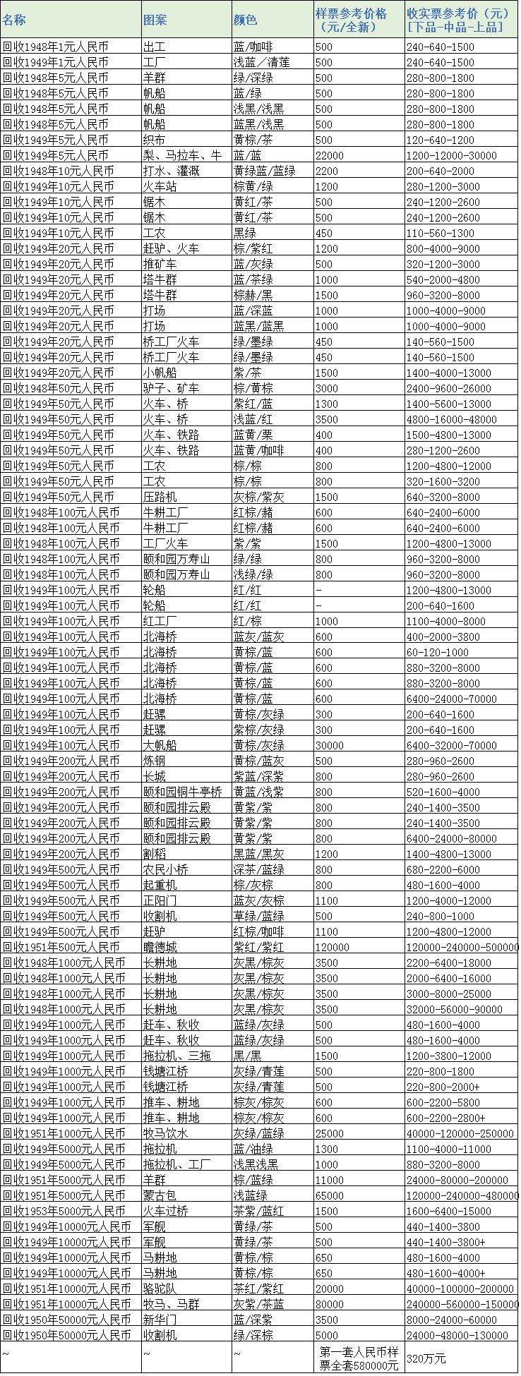 第一套人民币价格表及图片!