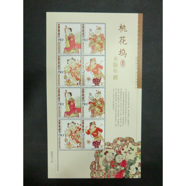 桃花坞木板年画特种的邮票是在2004年1月14日由国家邮政局发行的,一套共有4枚,小全张一枚。小全张的面值是4.4元,发行量为1020万。小全张的图案采用桃花坞木刻板年画,整张邮票看上去色调鲜艳不拘于真实,色彩多采用大红大绿等夸张的颜色,对于渲染过年气氛起到相当大的作用。