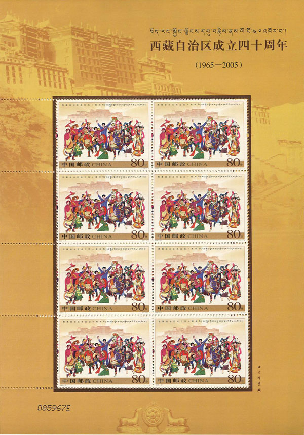 这款西藏小版张正是为了纪念西藏自治区成立四十五周年而发行的一款藏品,它的意义十分深远而且极具观赏价值,从这枚邮票的设计来看主打颜色是黄色,悠久目前这款2005年西藏版分为单枚票和小版票,在图案的设计上主打颜色是黄色,中间印刷着西藏的民族舞蹈以及身穿西藏传统服饰的人民,十分具有亲和力而且形象生动。
