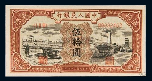 第一套人民币于1948年12月1日由刚成立的中国人民银行开始发行,共12种面额62种版别。这套人民币由时任华北人民政府主席的董必武题写了“中国人民银行”行名。票面上两方印章分别为“总经理章”和“副经理章。