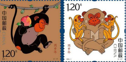国画大师黄永玉92岁高龄再度创作猴年邮票。本轮猴票图案内容分别为:灵猴献瑞、福寿双至。猴子手托寿桃,面带笑容,形象活泼可爱,生动传神。一只金猴抱着两只橘色的小猴象征亲情,也寄托着阖家团圆、福寿双至的吉祥寓意。