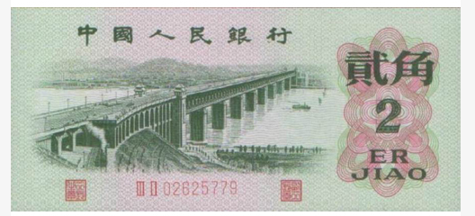 第三套人民币二角券(俗称长江大桥),1962发行时间1964年,2000年停止流通。第三套人民币2角因为“贰”的写法与现在字典上的写法不一样,“角”的写法更象是笔误,就有人在这两点上面做文章,说是错币而进行炒作,当然 这都是后来才发生的故事。