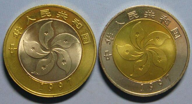 香港回归纪念币有两枚,正面的图案都印制了“中华人民共和国”七个大字,还有紫荆花的精美图案以及发行的年号。但是两枚纪念币也有区别,第一枚使用的制作工艺有一些不同,内圈使用白色的铜合金,而外圈使用的是黄色铜合金。而第二枚正好相反,内圈使用的黄色铜合金,外圈使用的是白色铜合金,这种不一样的工艺方便大家区分,不至于混淆。