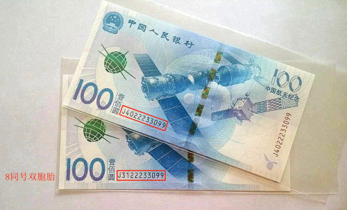 2015年11月26日中国人民银行发行我国第一枚航天题材纪念钞,2016年7月1日举行的网上拍卖中,一套由两枚号码分别为J4022233099和J3122233099的航天钞组成的8同号钱币被一位甄姓客户以22800元的拍卖价收入囊中,这次成交掀起了新一轮的航天钞收藏热。2016年8月18日斯宾克(Spink)在香港皇后大道西111号华富商业大厦四楼隆重举行,仅航天钞双胞胎号这一项就进行了二十余次竞价。起拍价为4000港币,最终成交价为9.6万元港币(含佣金共计1.6万港元)。本次拍卖成交价刷新了航天钞双胞胎国内拍卖价,并超过预期30倍以上。