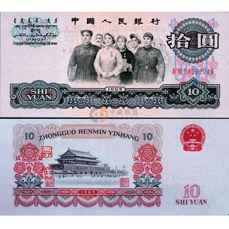 1965年10元人民币就是收藏市场上人们俗称的大团结,是第三套人民币中的老大哥。这张人民币在1966年发行的,有两种版本在市面上流通,分别是三罗马和二罗马。1965年10元人民币票面长度是15.7厘米,宽度是7.2厘米。票面的长度在第三套人民币名列前茅。同样有名的10元人民币是53年的大黑十,虽然1965年10元没有前者那么春风得意,但是在收藏界也有自己的一席之地。先简单的介绍一下“大团结”吧!