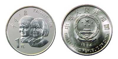 "希望工程"实施5周年纪念币:唯一一枚刊印了国名和纪念事件中英双语的普通纪念币。