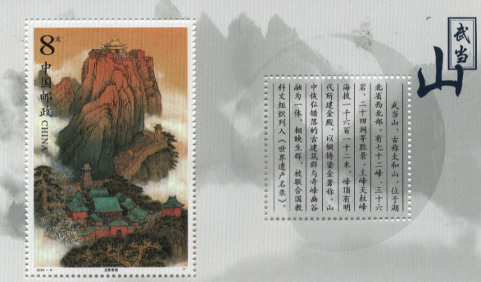 武当山又被人们称之为太和山,位于湖北省境内,武当山当中的山峰数量十分多,山峰之间有云雾缭绕,茂密的树林,清晰的河流,环境十分的优美,武当山上还有很多古老的建筑,规模宏大、建造工艺十分精湛,在1994年被列入世界文化遗产名录,为了宣传这一历史文化,我国邮电部在2001年5月26日,发行了2001-8武当山整盒小型张邮票,邮票的图案设计十分的精美,就像一件小的艺术品,而且该邮票刚发行,就受到全国各地集邮爱好者和投资者的密切关注,其市场价格总体处于上涨趋势,所以十分具有收藏价值。