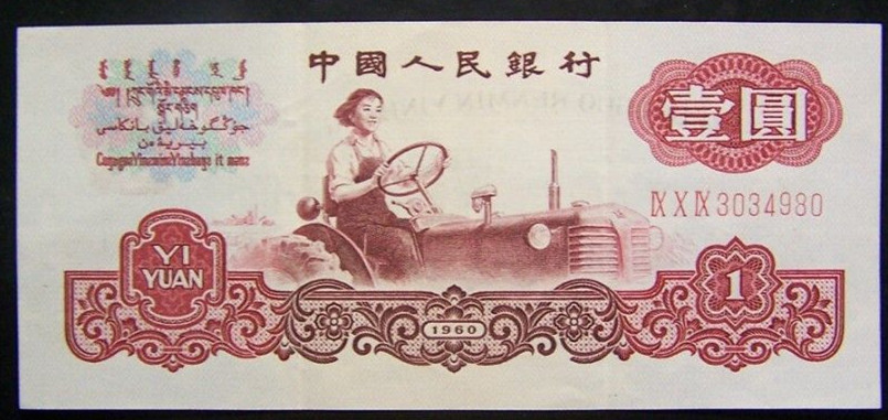 壹圆券(女拖拉机手图)有三种版别即:1元2字冠8位号码五星水印;1元3字冠7位号码五星水印;1元3字冠7位号码古币夹空五星水印。古币水印壹圆券(女拖拉机手图)正面图案为女拖拉机手;深红色;面值1元,背面图案为国徽和天山牧羊图;黑红色,年号为1960年;规格为131×57mm;发行日期为1969年10月20日;1991年3月1日只收不付。印刷工艺为双凹印。停用日期为2000年7月1日,兑换时间延续至2000年12月31日。