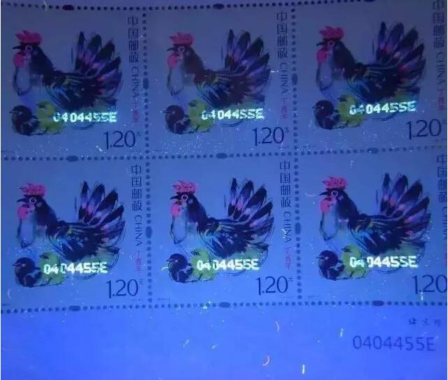 而今年发行的鸡票,当然也有大家司空见惯的荧光喷码: