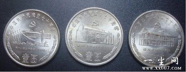 为庆祝1991年中国共产党成立七十周年,中国人民银行发行了建党70周年纪念币,这一套纪念币包括三枚,每一枚纪念币的图案不一样,分别代表了对于中国共产党的成立以及发展的三次大事件。其中包括中共一大的召开、遵义会议以及十一届三中全会,每一次会有都被载入史册,有着重要意义。