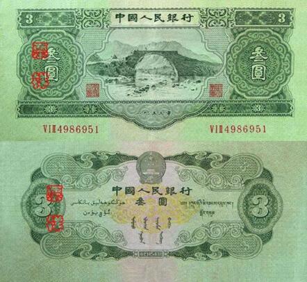 “苏三币”即第二套人民币中3元面值的纸币,也是我国唯一一次发行的3元面值纸币,只是因为是由国内设计并委托前苏联代为印制,所以才成为“苏三币”,但也正是这个原因造成了现在“苏三币”的价格是非常高的,其正面图案为吉安市永新县龙源口石桥图景,左右两边分别由“叁圆”字样,上方刊“中国人民银行”,下方刊“一九五三年”年号,而背面图案则为花纹、国徽以及汉、维、蒙、藏四种文字,整体色彩为淡绿色。当年因为历史原因,苏三币在流通使用九年后,于1964年5月15日停止流通,并大量被回收销毁,因而现在存世量是极少的,这也造成现在苏三币的价格是比较高的,大概在十万元左右,但具体还有看纸币品相如何。