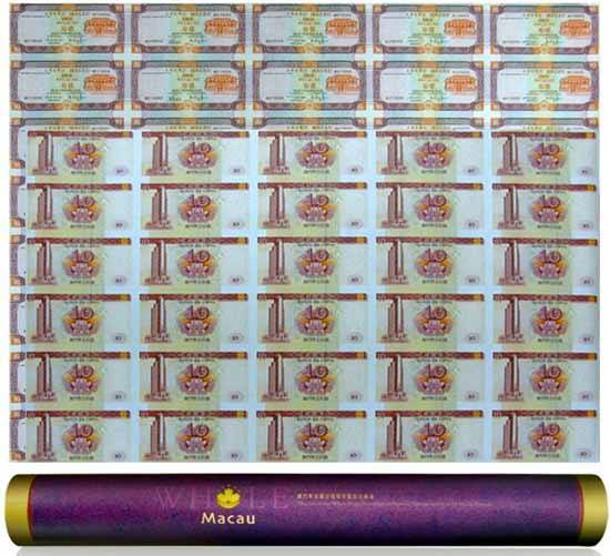 澳门10元双错整版钞俗称澳门大炮筒,目前被尊称为最有升值潜力的连体钞钞王之一。它是由中国银行及大西洋银行于2001联合发行。此套整版钞内含大西洋银行发行的10元券四十张整版钞一张、中国银行发行的10元券三十张整版钞一张,附有澳门金融管理局局长签发的“鉴定证书”,后四位号码均相同,装帧发行量1万套,面值700澳门元,面市之初约为2000元 。